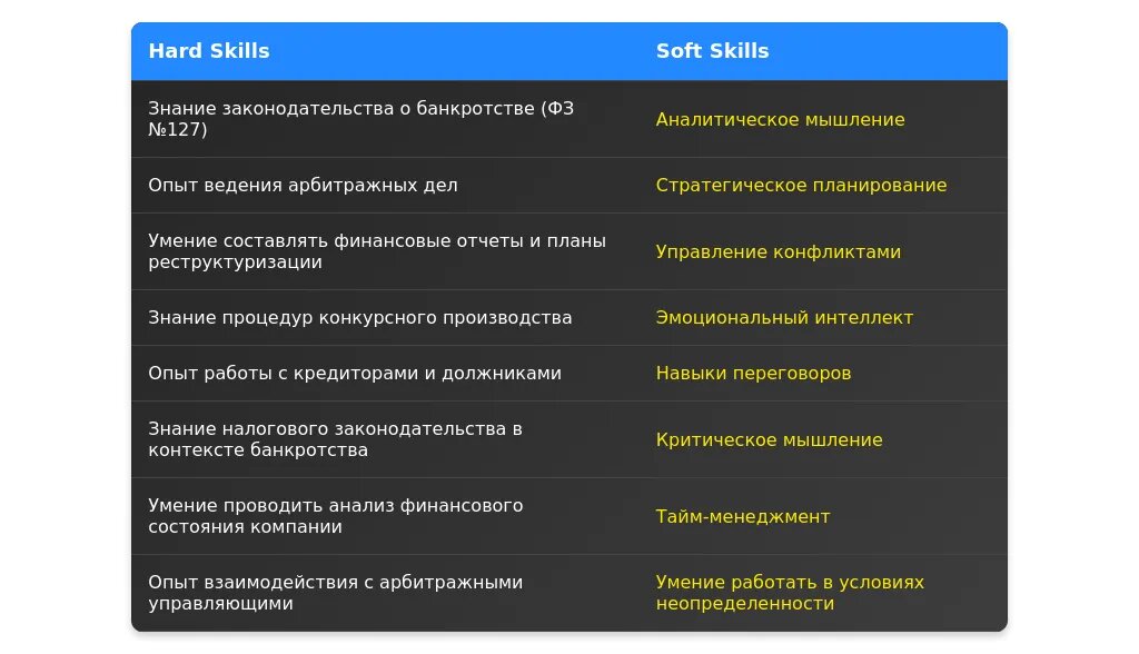 После адаптации: Навыки ведения переговоров с кредиторами, опыт работы в команде юристов, умение работать в условиях многозадачности.