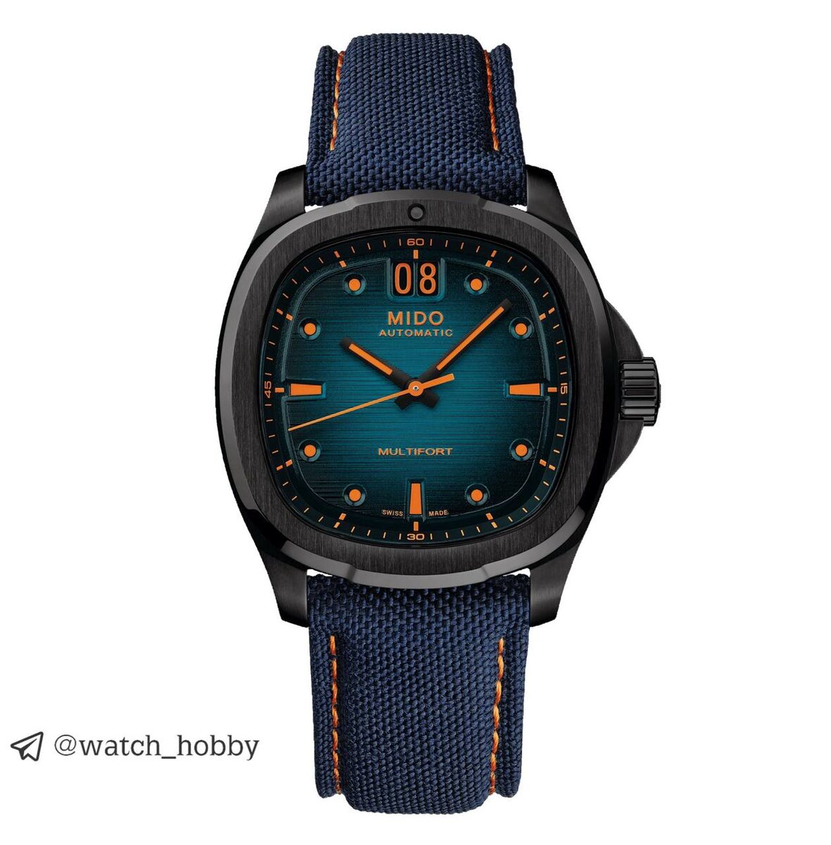 Mido TV Big Date в новой расцветке. Технически - это всё тот же 📺. Сталь + черное PVD, калибр 80, размер 39.2 х 40 мм. Дополнен корпус синим текстильным ремешком с оранжевой строчкой. Циферблат лазурного оттенка дополнен ярко-оранжевыми контрастными индексами, минутной разметкой, стрелками и датой, конечно же. Часовая и минутная стрелочки сделаны черными под цвет корпуса. Стоимость часов составляет 1.380 долларов или 120.000 рублей 💰, ориентировочно. Стильно, 100%. Делись мнением!