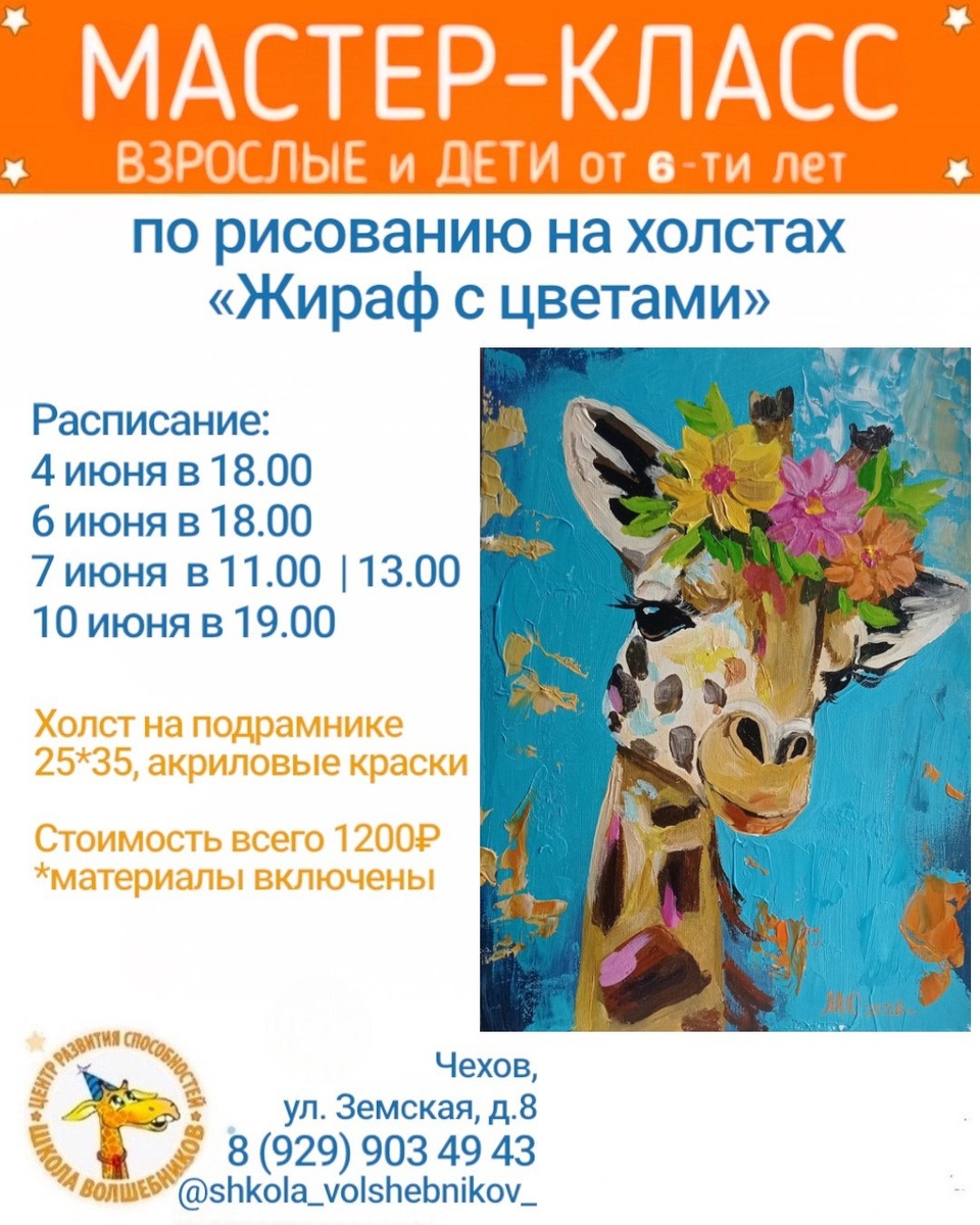✨ МАСТЕР-КЛАСС «Жираф с цветами»🦒 Напишем очень красивую картину на холсте акриловыми красками🎨 Такую картину очаровательным жирафиком🦒можно повесить дома или подарить своим близким в качестве подарка🎁 Ну и конечно, проведем отлично время в приятной компании🙂 Ждём Вас! 📅4 июня 🕛18.00 6 июня 🕛18.00 7 июня 🕛11.00 | 13.00 10 июня 🕛19.00 🚫 Возраст: 6+ 🏢 Центр Развития "ШКОЛА ВОЛШЕБНИКОВ" 📍 г.Чехов, микрорайон Губернский, ул.Земская, д.8 🔗 Записаться: https://wa.me/+79299034943 #детямЧехов #интересноЧехов ⭐Разместить публикацию ⭐Поддержать канал голосом ✅ Мероприятия Чехов https://dzen.ru/id/66cc4b48e9ef144699238a51 http://vk.com/chekhov_events http://dzen.ru/chekhov_events