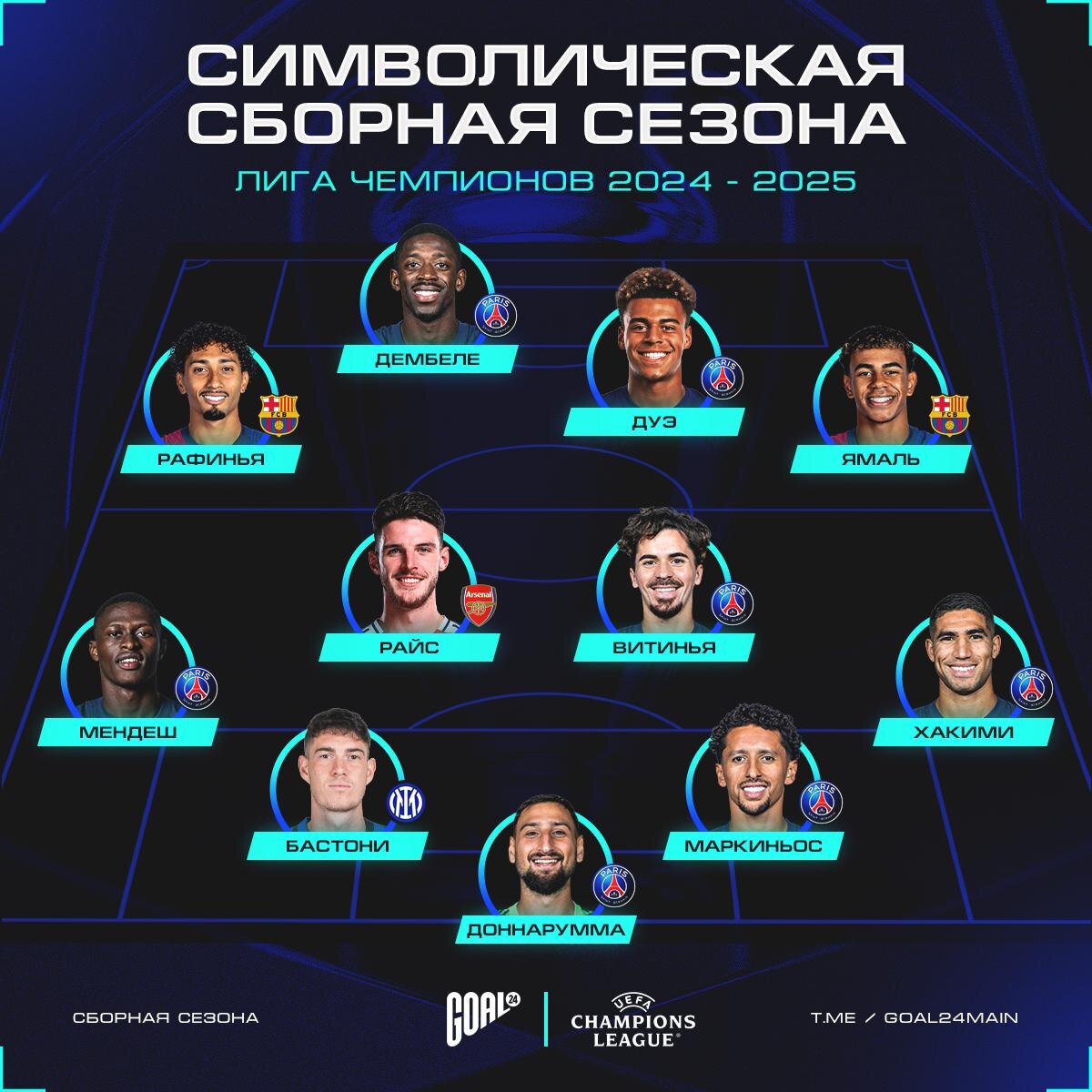 Сезон Лиги чемпионов 2024/25 уже вошёл в историю — захватывающие матчи, сенсационные результаты и индивидуальные шедевры. И вот мы видим итог: символическая сборная турнира по версии Goal и UEFA. Это не просто список звёзд — это имена, которые определяли ход сезона. Настоящая стена в воротах парижан. Спасения Доннаруммы не раз вытаскивали команду в критические моменты. Один из лучших сезонов в его карьере. ПСЖ доминирует и в обороне — три защитника из четырёх представляют клуб с "Парк де Пренс". Хакими и Мендеш разрывали фланги, Маркиньос обеспечивал спокойствие в центре, а Бастони из "Интера" был настоящей опорой миланцев. Райс провёл фантастический дебютный сезон в Лиге чемпионов за "Арсенал" — лидер, двигатель и разрушитель в одном лице. Витинья — мозг ПСЖ, дирижёр атак, который сделал ещё один шаг к звёздному статусу. Творческая и скоростная линия атаки. Дембеле и Заир-Эмери — ключевые фигуры прогресса ПСЖ в этом сезоне, Ямал стал настоящим открытием турнира, а Рафинья — стабильным