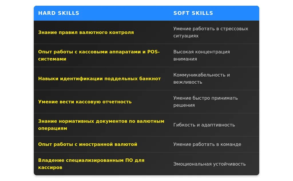 Soft skills — это личные качества, которые помогают эффективно выполнять работу. Для валютного кассира особенно важны: