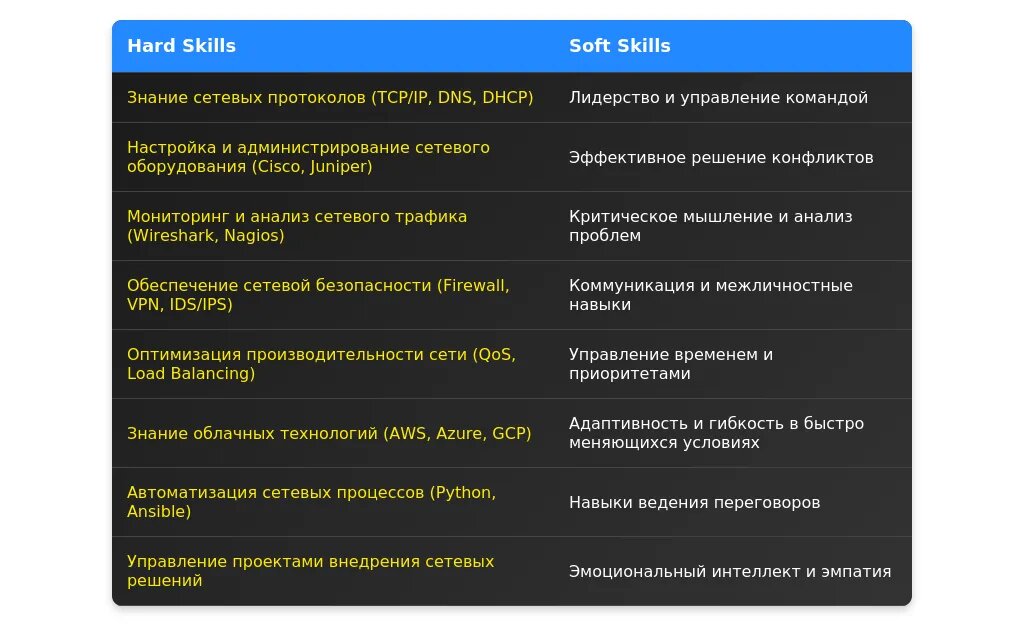 - Hard Skills: настройка сетевого оборудования, анализ трафика, внедрение новых технологий.
