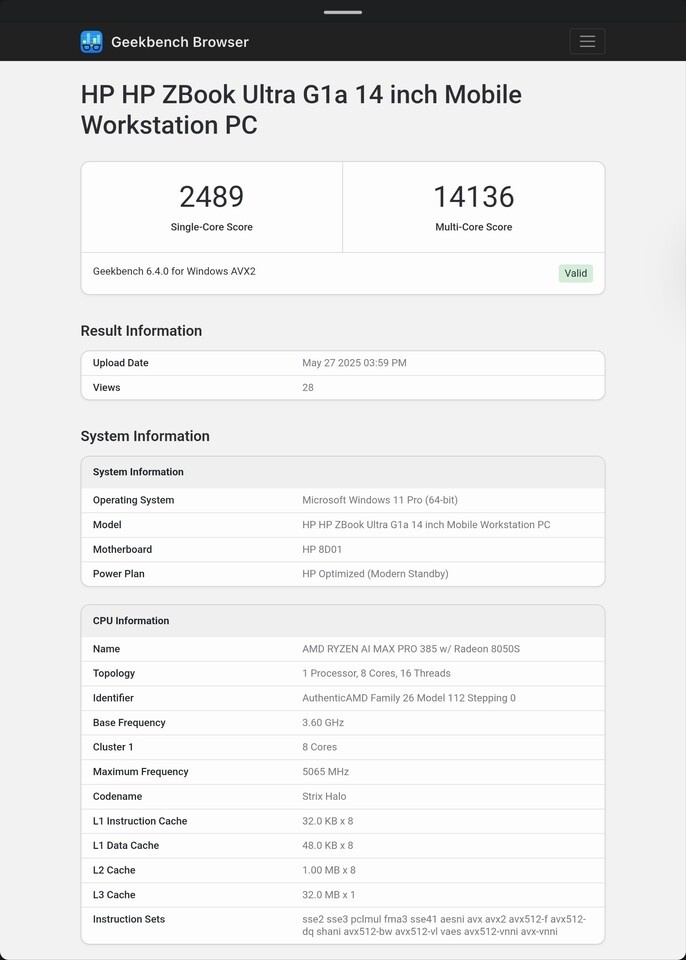 В Сети появились первые результаты тестирования новой мобильной APU от AMD — Ryzen AI Max Pro 385. Это упрощённая версия линейки Strix Halo, которая должна стать доступным вариантом для пользователей, не готовых платить за топовые конфигурации. В бенчмарке Geekbench была замечена сборка на базе HP ZBook Ultra G1a с 32 ГБ ОЗУ, где процессор показал хорошие результаты: 2 489 баллов в однопоточном режиме и 14 136 в многопоточном. Это говорит о том, что даже урезанный вариант чипа остаётся достаточно мощным для сложных задач. Однако в отличие от старшего Ryzen AI Max+ 395, который имеет 16-ядерный процессор и видеоядро Radeon 8060S, младшая модель получила 8-ядерный CPU и 32-ядерный GPU. Такое решение делает её менее производительной, но более привлекательной в плане энергоэффективности и цены. Хотя точные данные о стоимости новых ноутбуков пока отсутствуют, можно предположить, что они будут дешевле текущих устройств на Ryzen AI Max+. Сегодня такие устройства стоят более $2000, а значит, P