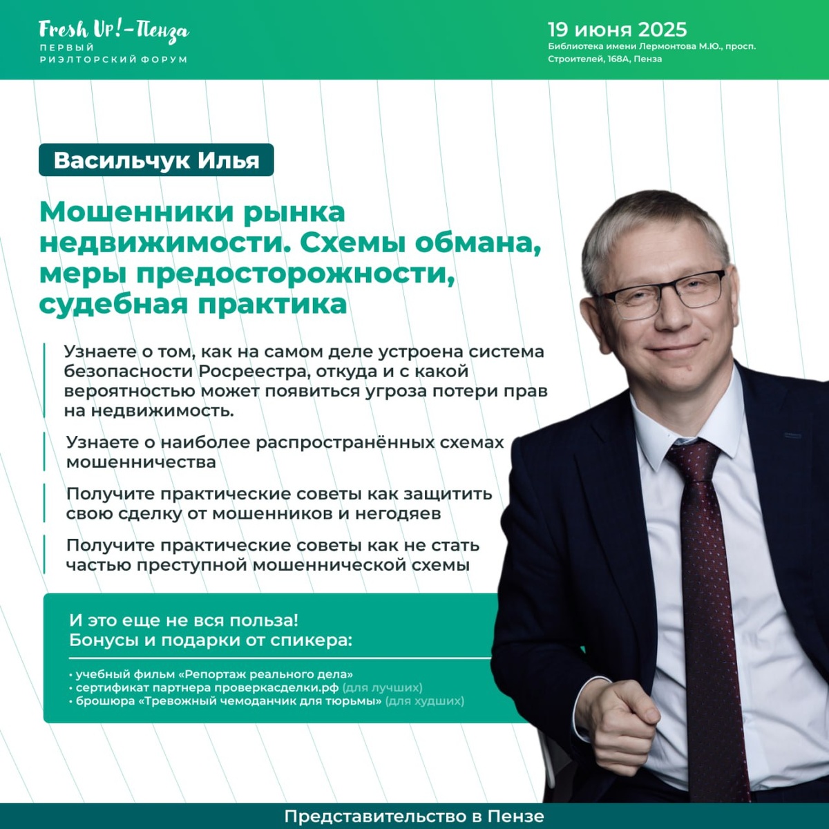 🕵️♂️ На рынке стало слишком много "серых" схем и "чёрных" агентов? Боишься втянуть клиента в риск? Не уверен в контрагентах? Илья Васильчук проведёт авторский семинар о мошенниках на рынке недвижимости. Тема, о которой не говорят вслух — но нужно знать каждому. — Схемы обмана и как их распознать — Судебная практика — Как защитить себя и клиента 📆 19 июня 📍 Место: Библиотека им. Лермонтова, Пенза 🚨 Безопасность — это сервис. Регистрируйся