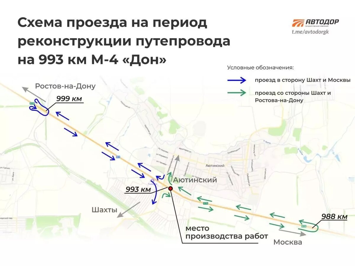 Из-за реконструкции мостов на М-4 «Дон» в Ростовской области до апреля 2026 года изменится схема движения. Об этом сообщили в донском министерстве транспорта. С 9 июня 2025 года на М-4 «Дон» начнется реконструкция на 982-м, 993-м и 1 000-м километре дороги. Это развязка Шахты — Новочеркасск — Новошахтинск. По этой причине до апреля следующего года изменится схема движения на нескольких участках. По направлению с севера в Шахты организован разворот на 997-м километре М-4 «Дон». Также обеспечен съезд вправо за 993-м километром (пост ДПС в районе поселка Аютинского) или разворот на 1 000-м километре (Майский — Новошахтинск) с последующим съездом на улицу Дачную в городе Шахты. Выезд из Шахт на М-4 на север возможен вправо с улицы Дачной, в районе поста ДПС в поселке Аютинском. На юг М-4 из этого же города можно попасть с улицы Дачной, с разворотом на 997-м километре. Чтобы выехать из Шахт на север, в поселки Аютинский и Таловый, нужно двигаться вправо на М-4, в районе поста ДПС развернуть