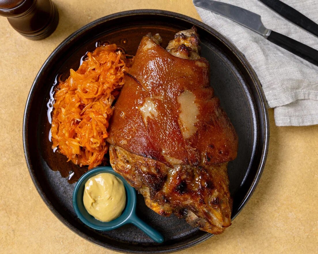 Для рульки: ✔️Свиная рулька — 1 шт. ✔️Светлое пиво — 1 л ✔️Вода — 1 л ✔️Корица — 20 г (палочка или крупный помол) ✔️Бадьян — 5–6 шт. ✔️Гвоздика — 3–4 шт. ✔️Соль и перец — по вкусу Для капусты: ✔️Квашеная капуста — 200 г ✔️Лук — 50 г ✔️Морковь — 30 г ✔️Томатная паста — 15 г ✔️Сахар — по вкусу ✔️Растительное масло — для жарки Для глазировки: ✔️Мёд — 30 г ✔️Дижонская или зернистая горчица —30 г ✔️Подсолнечное масло — 1-2 ст.л