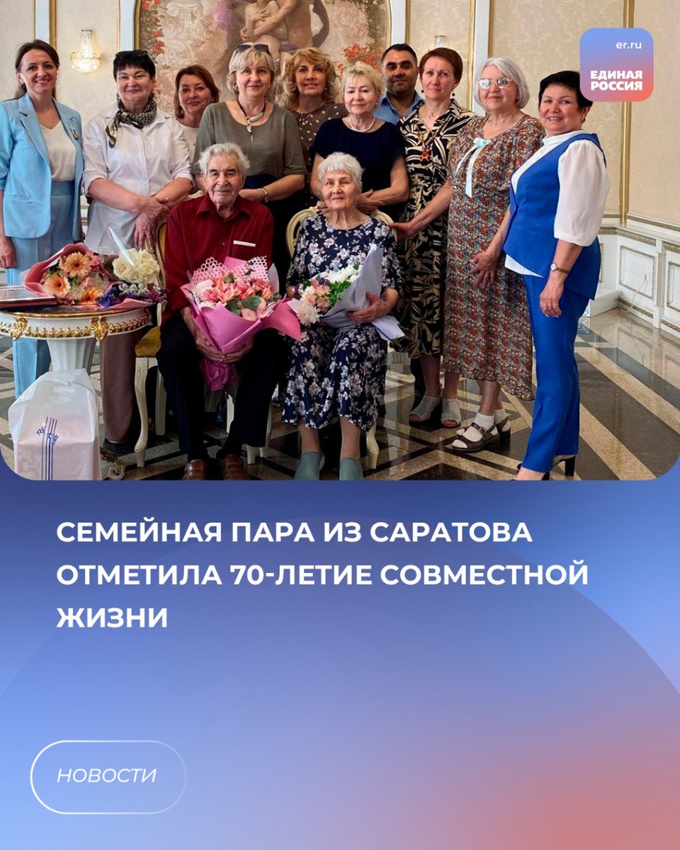👍🏻Супругов Решетниковых – Евгения Павловича и Татьяны Алексеевны, отпраздновавших 70-летие совместной жизни торжественно поздравили во Дворце бракосочетаний. Региональный координатор проекта «Старшее поколение» партии «Единая Россия», депутат Саратовской городской Думы Ирина Видина поздравила супругов с праздником. 💬«За эти годы супруги Решетниковы создали крепкую семью, в которой родились две дочери и двое внуков. На протяжении всей жизни Евгений Павлович и Татьяна Алексеевна поддерживали друг друга в любых жизненных ситуациях, их союз был основан на взаимопонимании, уважении и, конечно же, на большой любви. В торжественной обстановке поздравила супругов с этой прекрасной датой, пожелала здоровья, радости и благополучия», - поделилась Ирина Видина. Поэтесса Наталья Исаева исполнила песни для семьи и гостей мероприятия.