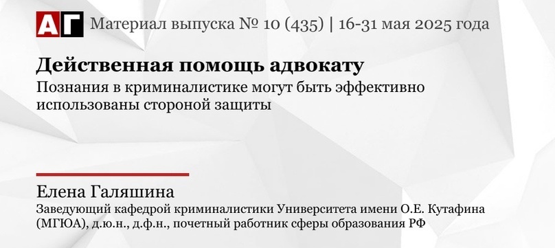 Познания в криминалистике могут быть эффективно использованы стороной защиты. В Адвокатской газете вышла новая статья заведующего кафедрой криминалистики МГЮА Елены Игоревны Галяшиной "Действенная помощь адвокату". В статье рассмотрено, в каких направлениях познания в криминалистике могут быть полезны в адвокатской деятельности. Автором обосновывается эффективность использования разработанных тактических приемов криминалистики, методики расследования отдельных видов преступлений и важное значение криминалистических знаний для анализа адвокатом-защитником материалов уголовного дела как в досудебной, так и в судебной стадии, позволяющих компетентно судить не только о самом познаваемом событии, но и о путях и способах его исследования, а также о научной обоснованности мер, предпринятых для раскрытия, расследования и разрешения уголовных дел, выявить допускаемые в познании события преступления следователем, судом криминалистические ошибки, которые могут привести к недостоверным результатам