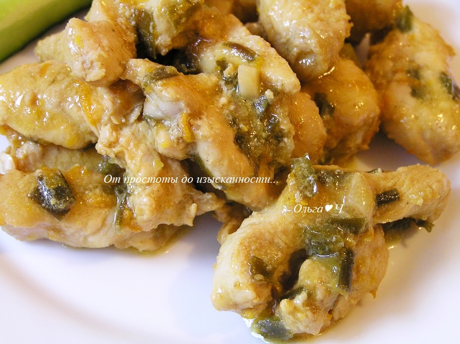 растительного масла Приготовление: Лук-порей мелко нарежьте, обжарьте 1-2 минуты на растительном масле, добавьте мелко нарубленный чеснок, обжарьте еще 1-2 минуты, выложите в миску. Натрите цедру и выжмите сок из лайма и апельсина; отставьте в сторону апельсиновый сок. Выложите всю цедру и перелейте сок лайма к зеленому луку. Добавьте соевый соус, мед, чили, тмин и кориандр. Разрежьте куриные грудки вдоль на полоски шириной 1 см, затем добавьте их к соевой смеси и тщательно перемешайте. Накройте и маринуйте 15 минут. Шумовкой достаньте курицу из маринада, маринад оставьте. Разогрейте немного растительного масла в той же сковороде в которой