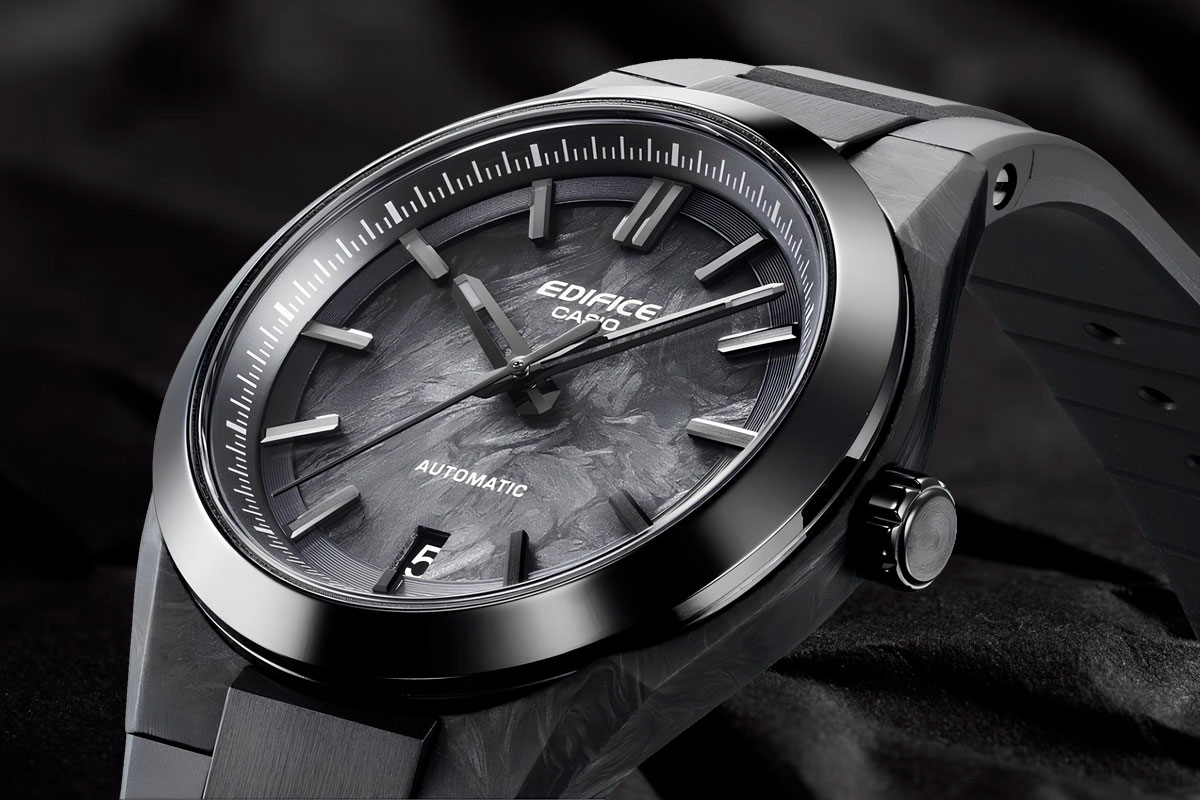 В продолжение нашей первой статьи о грядущей механике от CASIO (EFK-100 — первая механика от CASIO?) мы хотим порадовать вас крутыми рендерами EFK-100XPB-1A — одной из моделей этой же серии. Судя по всему, японцы во всю готовятся к релизу серии, и по слухам EFK-100 официально представят уже в июле-августе этого года. Ну а мы с вами пока насладимся часовой эстетикой EFK-100XPB… Эта модификация EFK будет полностью в черном исполнении — вплоть до часовых меток, фона циферблате и держателя ремешка. По задумке дизайнеров, расцветка станет флагманом серии, предлагая не только сталь, но и более изысканный материал. Думаем вы уже догадались, что речь идет о карбоне. Причем карбон присутствует не только в корпусе, но и на циферблате — текстура углеродного волокна хорошо видна под стеклом. Заметьте, по своему строению текстура циферблата отличается от базовых версий EFK-100 — очевидно, это такая технология литья и склейки углеродного волокна в единый рисунок. У каждых отдельных EFK-100XPB-1A буд