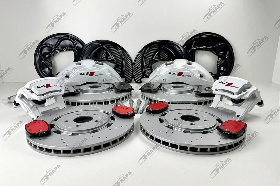 Друзья, всем привет! Сегодня рассмотрим красивый белоснежный комплект Audi RS для Audi Q7 и Q8, данный комплект мы продаем с высокопроизводительными дисками от Atomic Brake System (ABS) с направленной вентиляцией, обладающими повышенным теплоотводом и пониженным коэффициентом шума. Артикулы будут от заводской черной системы, красился комплект по желанию клиента. Передняя ось: Суппорт Akebono 10 поршневой черный левый — арт. 4K0615107N — 1шт.