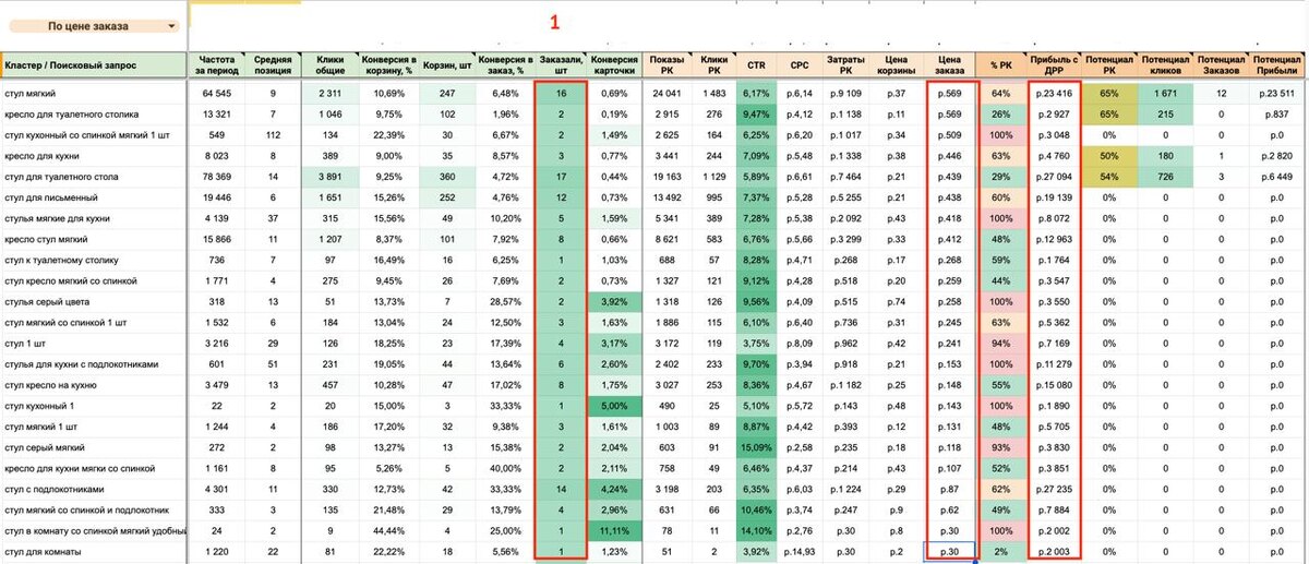 Как выстроить стратегию продвижения на маркетплейсе — профессиональные рекомендации Я часто вижу одну и ту же ошибку у селлеров: гонятся за красивой эффективностью по рекламным показателям, забывая про реальный бизнес. Давайте разложим по полочкам, как правильно строить стратегию продаж и почему важно работать не только с низкочастотными, но и с высокочастотными ключами. 1. У каждого селлера должен быть чёткий план! • План продаж на месяц • План маржинальной прибыли (в рублях, а не только в процентах!) 2. Сначала — “длинный хвост” (низкочастотные и среднечастотные ключи): • Максимально эффективные заказы • Высокая маржа на единицу товара • Быстрый возврат инвестиций Пример из практики ( Скрин 1 ): • 114 заказов • 208 134 ₽ прибыли • Средняя прибыль с заказа — 1 825 ₽ НО! Очень часто низкочастотные и среднечастотные ключи просто не дают нужного объёма заказов. Вы выжимаете из них всё — и всё равно по плану продаж не дотягиваете. 3. Вот тут и приходит время для средне - и высокочас