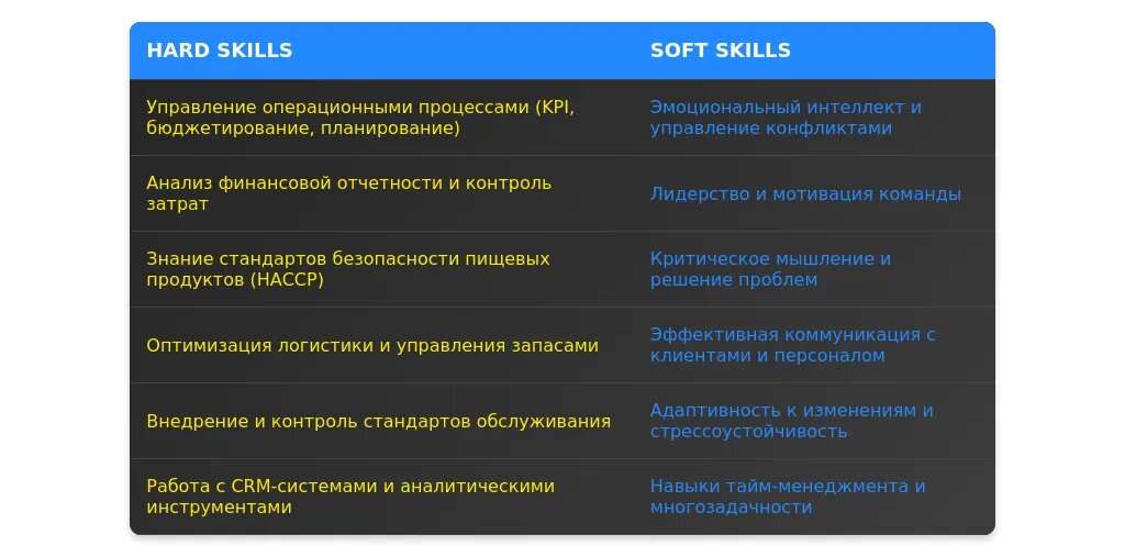 "Управление персоналом, оптимизация процессов, знание стандартов HACCP, опыт работы с франшизами."