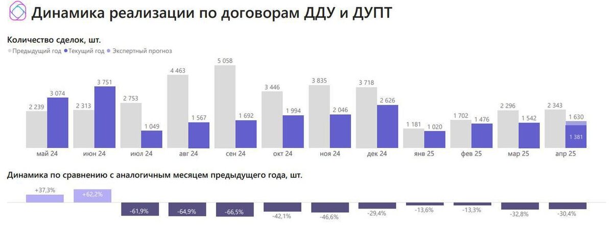 Екатеринбург в лидерах среди региональных столиц по количеству сделок по ДДУ и ДУПТ в новостройках Согласно данным сервиса цифровой аналитики Объектив.РФ, всего в апреле 2025 года было продано 1 630 лотов по договорам ДДУ\ДУПТ. Количество сделок по сравнению с мартом 2025 г. увеличилось на +5,7%. Примечательно, что 57,5% сделок прошло с использованием ипотеки. В апреле 2025 г. на витрине застройщиков оказалось 35 234 лота в новостройках (динамика к марту 2025 года составила +5,5%),а их общая площадь составила 1 764 587 м2 (динамика к марту 2025 года оказалась на уровне +0,1%). Средняя цена квадратного метра в продаже в апреле 2025 года - 166 455 тыс. руб. (не изменилась по сравнению с мартом 2025 года). Наиболее востребованными стали квартиры площадью 30-40 кв.м.– 30,3% от всех проданных квартир в новостройках оказались в этом метражном интервале. В пятерку девелоперов по объему реализации вошли: ГК КОРТРОС (доля рынка 8,5%) Группа Эталон (доля рынка 7,8%) Страна Девелопмент (доля