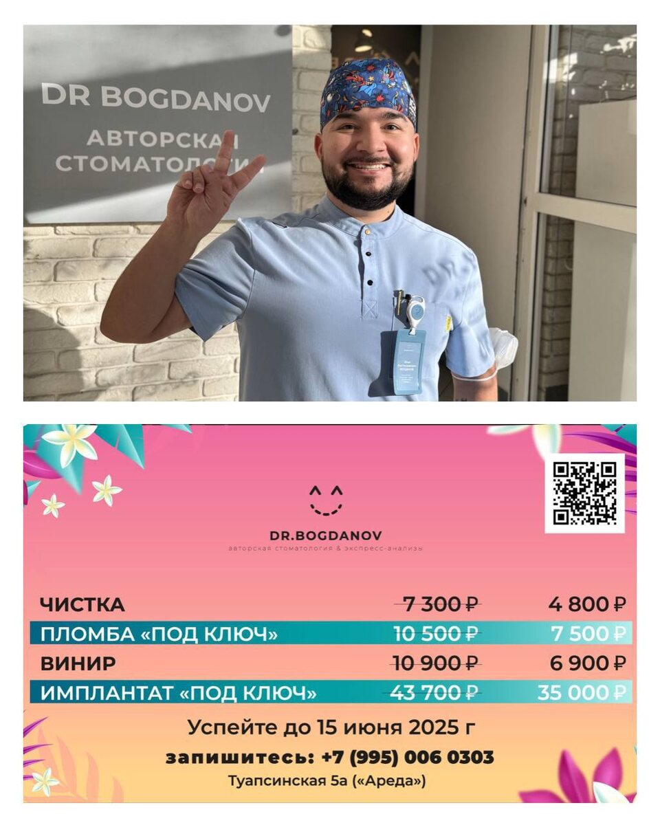 Добрый день, Сочи. Только до 15 июня для подписчиков @dr_bogdanov специальное предложение: - Проф. чистка — 4.800 вместо 7.300 - Премиум-пломба (всё включено) — 7.500 вместо 10.500 - Композитный винир 6.900 вместо 10.500 - Имплантат под ключ — 35.000 вместо 39.000 Почему выбирают нас? - Работа под микроскопом — точнее не бывает - Удаление зубов ультразвуком — без боли, без страха - Современные технологии — от сканера до CAD/CAM - Коронки и виниры — без слепков, без лишних визитов - Официальная гарантия на всё - Качество лично проверяет главный врач - Опытные врачи, которым действительно можно доверять Запишитесь прямо сейчас: +7(995)006-03-03 или онлайн на drbogdanov.site — начните копить кешбэк уже с первого визита! Смотрите реальные “до/после” у нас в соцсетях: @dr_bogdanov Авторская стоматология и экспресс-анализы DR БОГДАНОВ, г. Сочи, Туапсинская 5А (мкрн Ареда) ООО “Элис” Лицензия №ЛО-23-01-006908 Имеются противопоказания. Необходима консультация врача. Подробности акций — на