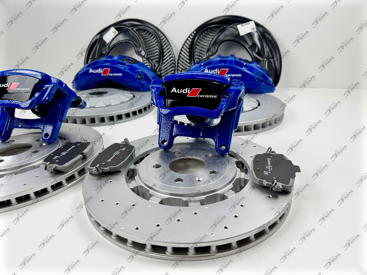 Друзья, всем привет! Сегодня рассмотрим тормозную систему для Audi Q7, данный комплект мы продаем с высокопроизводительными дисками от Atomic Brake System (ABS) с направленной вентиляцией, обладающими повышенным теплоотводом и пониженным коэффициентом шума. Артикулы будут от заводской черной системы, красился комплект по желанию клиента. Передняя ось: Суппорт Brembo 6 поршневой черный левый — арт. 4KE615107F — 1шт.