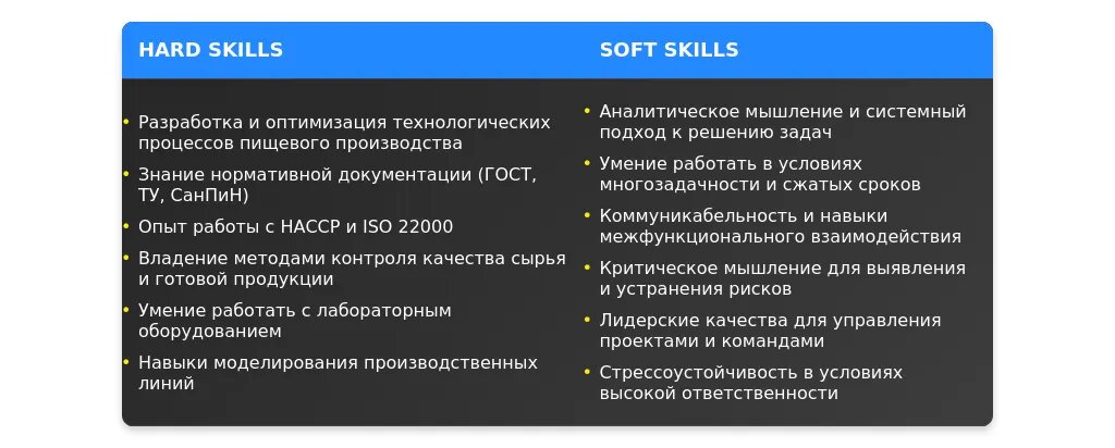 После: "Знание стандартов HACCP, контроль качества, работа с документацией, знание оборудования."