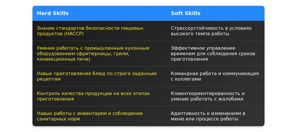 - Упомяните основные навыки, такие как соблюдение стандартов, работа в команде, соблюдение гигиены.