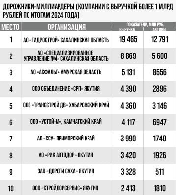 Ежегодно именно заказы на строительство и реконструкцию дорог на Дальнем Востоке оказываются в топе госзакупок. Из раза в раз рейтинги возглавляют практически одни и те же компании. Многим за теплый сезон удается заработать миллиарды. Рассмотрим подробнее, кто зарабатывает на работе с асфальтом больше конкурентов. В списке дорожников-миллиардеров 2024 года, опубликованном на сайте “Дальневосточного обозрения” 27 компаний. “Золото” и “серебро” ушли на Сахалин - островные АО “Гидрострой” и АС “Специализированное управление №4” за прошлый год заработали почти 19,5 и 8,9 млрд рублей соответственно. В десятку также попали предприятия из Амурской области (снова АО “Асфальт”), Якутии (ООО Объединение “СРП”, АО “РИК Автодор”, ЗАО “Дороги Саха”), Хабаровского края (ООО “Трансстрой ДВ”), Камчатки (ООО “Устрой-М”) и Приморья (АО “ССУ”). Полный список тех, кто не разменивается на миллионы в важном деле превращения направлений в пути, по которым, возможно, сумеет проехать не только внедорожник, ищи