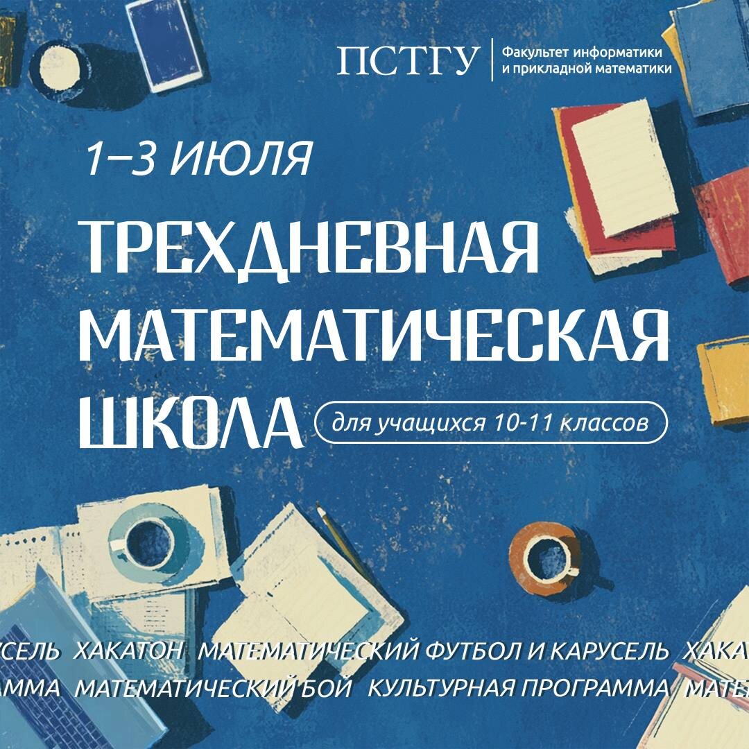 Будущие математики и IT-специалисты, ждем вас! ⚡️ Приглашаем учеников 10-11 классов принять участие в Трехдневной математической школе ПСТГУ, которая пройдёт 1-3 июля. Факультет информатики и прикладной математики подготовил насыщенную программу для тех, кто готов бросить вызов самым интересным задачам по математике и информатике. Вас ждёт дружеская соревновательная атмосфера, где вы сможете проявить свои таланты и познакомиться с единомышленниками, преподавателями и студентами факультета. Вас ждет ⬇️ 🔵математический футбол 🔵математический бой 🔵хакатон 🔵увлекательная культурная программа с посещением знаковых мест Москвы 🔗 Все подробности и регистрация 🔥 Важная информация! С этого года студенты программы «Администрирование информационных систем» могут получать стипендию 20 000 рублей в месяц – подробности Подписаться на ПСТГУ 👨🏫 Задать вопрос #Абитуриентам_ПСТГУ #Школьникам_ПСТГУ