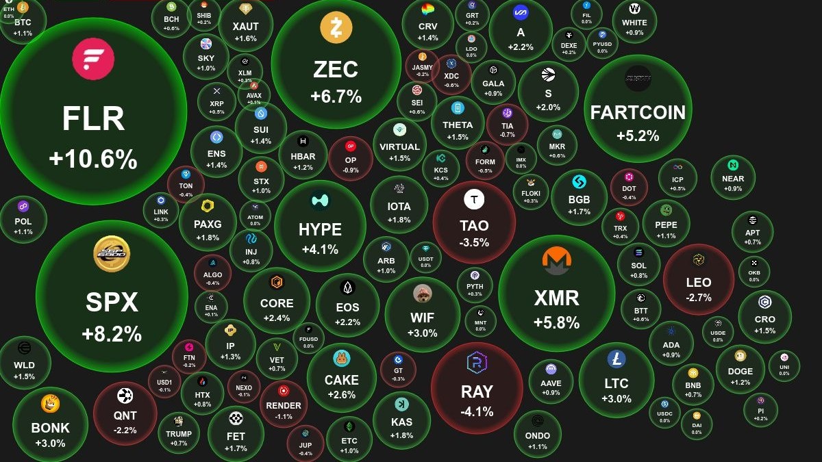 📊 Ежедневный обзор рынка криптовалют от Coinbubbles.ru 🗓 02.06.2025 11:06 по Москве. 🔗 Посмотреть на сайте 📈 Лидеры роста (из ТОП-100): 🟢 Flare (FLR): $0.0191 (+10.6%) 🟢 SPX6900 (SPX): $1.0394 (+8.2%) 🟢 Zcash (ZEC): $53.58 (+6.7%) 📉 Лидеры падения (из ТОП-100): 🔴 Raydium (RAY): $2.4177 (-4.1%) 🔴 Bittensor (TAO): $413 (-3.5%) 🔴 LEO Token (LEO): $8.4586 (-2.7%) 🔍 Основные метрики: 🟢 Общая капитализация: $3289.80 млрд (+0.89%) 🟢 Общий объем торгов: $91.42 млрд (+4.72%) 🟢 Доминация Bitcoin: 63.70% (+0.15%) 🔴 Доминация Ethereum: 9.20% (-0.08%) 🟢 Индекс страха и жадности: 64 / 100: ЖАДНОСТЬ (+8) 🟢 Индекс Альтсезона: 22 / 100: БИТКОИН-СЕЗОН (+1) 📖 Интересные статьи: 👉 Airdrop Checker. Проверка кошельков на бесплатные раздачи криптовалют. 👉 Майнинг на GPU видеокартах - подробное руководство для новичков. 👉 Что выбрать для майнинга криптовалют: асики или видеокарты