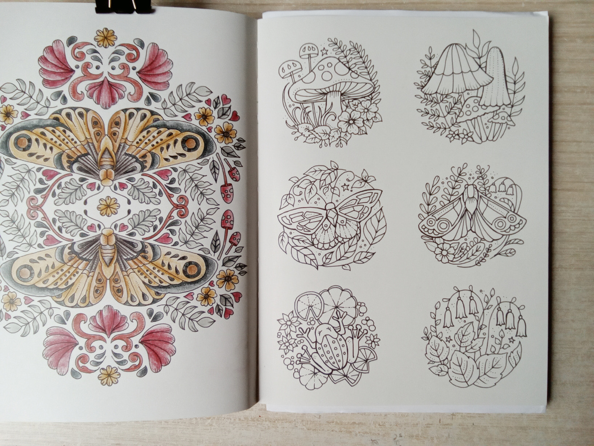 Всем чернично-космический привет! Решила пораскрашивать в раскраске Small Victories от Джоанны Бэсфорд. Она мне нравится и своим небольшим форматом и разнообразием прелестных иллюстраций. Полистала и выбрала вот эту картинку, рядом с уже раскрашенными мотыльками. Здесь шесть чудесных сюжетов в миниатюре. Задумалась над цветовой палитрой. Обычно я сразу подбираю несколько оттенков для всей композиции. Так. А как поступить здесь? Раскрасить все в одной палитре? Ладно. Таким способом сделаю что-то другое в этой раскраске. А сегодня для каждой картинки подберу отдельные цвета, но объединю их вот этим зелёным. Он будет использоваться на мелких листочках. Буду красить по порядку. И первая миниатюра - с грибами и цветами. Выбрала карандаши Berlingo SUPER SOFT Pro. Отобрала цвета в красно-розовой гамме. Плюс зелёный. Мухоморы всегда крашу красным. И здесь не отхожу от привычки. Чуть не забыла про ножки грибов - они серые. Грибы и цветы тоже розовые с красным. Как и цветы и их листья.