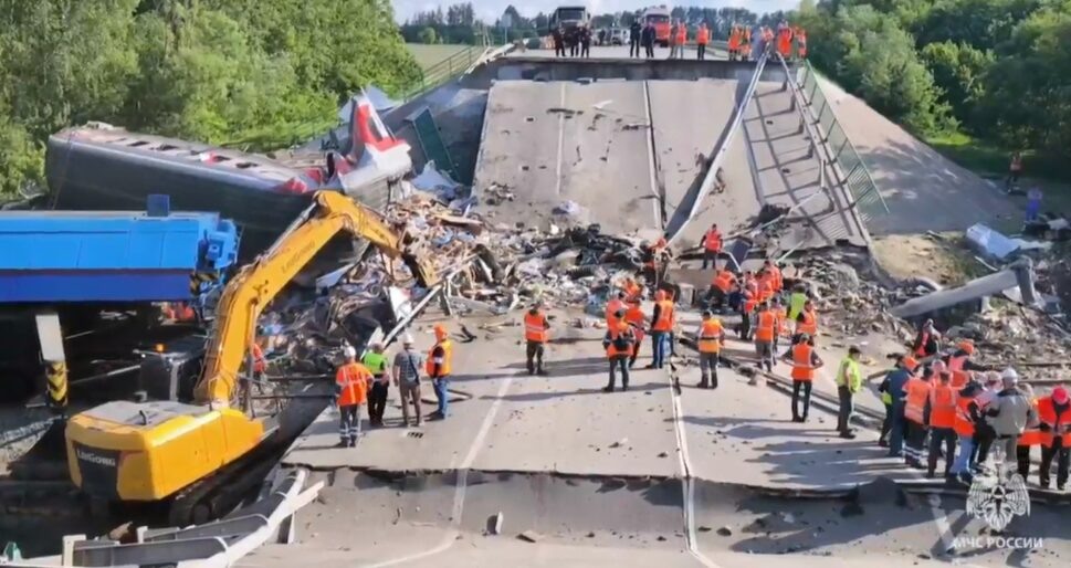 Спецтехника МЧС России в воскресенье эвакуирует искореженные вагоны поезда, сошедшего с рельсов из-за обрушения моста в Брянской области. Сотрудники ведомства с помощью автокрана поднимают часть разбитого вагона, после чего ремонтно-восстановительный состав освобождает железнодорожное полотно. В пресс-службе МЧС отметили, что на месте работают 72 специалиста и 12 единиц техники. По данным Московской железной дороги, в субботу в 22:44 на перегоне Пильшино — Выгоничи пассажирский поезд Климов — Москва сошел с рельсов из-за обрушения автомобильного моста «в результате незаконного вмешательства в деятельность транспорта». Губернатор Брянской области Александр Богомаз сообщил, что погибли 7 человек, еще 71 пострадал, 47 из них, в том числе трое детей, госпитализированы с ранениями разной степени тяжести. В настоящее время проводятся неотложные следственные действия, направленные на установление всех обстоятельств произошедшего. Возбуждено уголовное дело. В воскресенье официальный представит