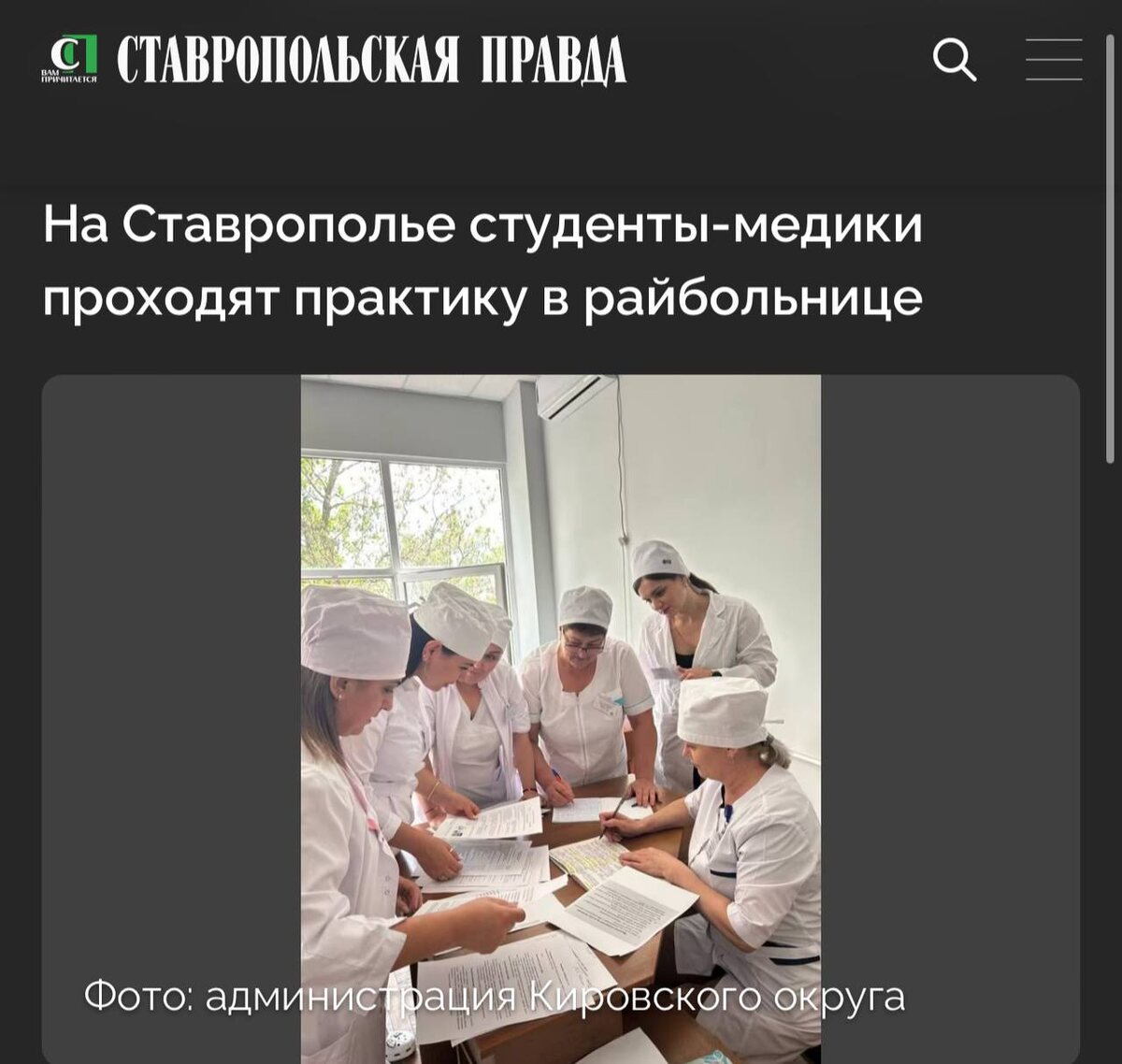 #КировскийокругвобъективекраевыхСМИ На Ставрополье студенты-медики проходят практику в райбольнице Студенты из Новопавловского филиала Северо-Кавказского медицинского колледжа проходят практику в Кировской центральной районной больнице. Под чутким руководством опытных врачей и медицинских сестёр будущие специалисты погружаются в реальную медицинскую среду и совершенствуют свои навыки. Они участвуют в повседневной работе больницы, взаимодействуя с пациентами и коллегами. Напомним, в своём Послании губернатор Владимир Владимиров отметил, что одна из ключевых проблем здравоохранения — нехватка квалифицированных медицинских работников. Для её решения используются все возможности. В частности, в этом году планируется увеличить набор в краевые медицинские колледжи на бюджетные места на 40 процентов. В 2025–2026 учебном году планируется принять 1250 человек на бюджет.