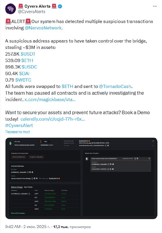 🏳️🌈 Команда CyversAlerts обнаружила несколько подозрительных транзакций, связанных с Nervos Network