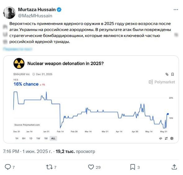 "За океаном" дали оценку вероятности применения ядерного оружия Некий "Murtaza Husssaln" разместил в социальной сети "X" график зависимости вероятности применения ядерного оружия по отношению ко времени. На графике проглядываются многочисленные экстремумы, что соответствует резкому снижению или повышению "накала" в сфере ядерного сдерживания. Значение максимума крайней точки в 16% дает понять, что удары ВСУ по значимым для России объектам носит резкий политический характер, так как критических повреждений сами носители не получили. Подпишись на @Ядер.Go