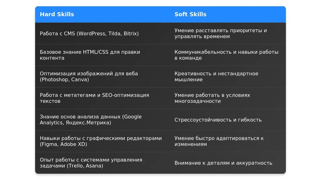 После адаптации: "Знание английского языка (Intermediate), работа в команде, управление контентом, аналитика данных."