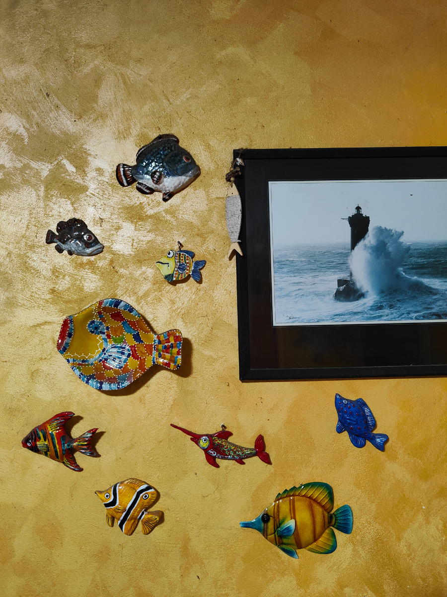 По заявкам читателей моего ТГ-канала и на волнах #моретерапии представляю краткий обзор своей коллекции рыб.🐟🐠🐡 🐡Коллекция возникла случайно, она началась с этих двух керамических рыб, подаренных мне мамой. Надо сказать, что они не несли какого-то глубокого символического смысла. Ну разве что могли символизировать тот факт, что мои дети родились под знаком Рыб. Поначалу я не знала, куда их пристроить, и они довольно долго пролежали на полке в самом дальнем углу (чтобы случайно не уронить и не разбить), пока я не решила повесить их на стену в гостиной рядом с большим постером с фотоизображениями маяков, о которые разбиваются океанические волны. Мне показалось, что это будет логичным продолжением морской тематики. 🐟 Следующими экземплярами в новой коллекции стали две яркие керамические рыбки ручной работы, которых мне преподнесли дети на юбилейный день рождения. На сей раз они озвучили символичный смысл подарка, заявив, что эти рыбки олицетворяют их самих. Так что теперь, глядя на