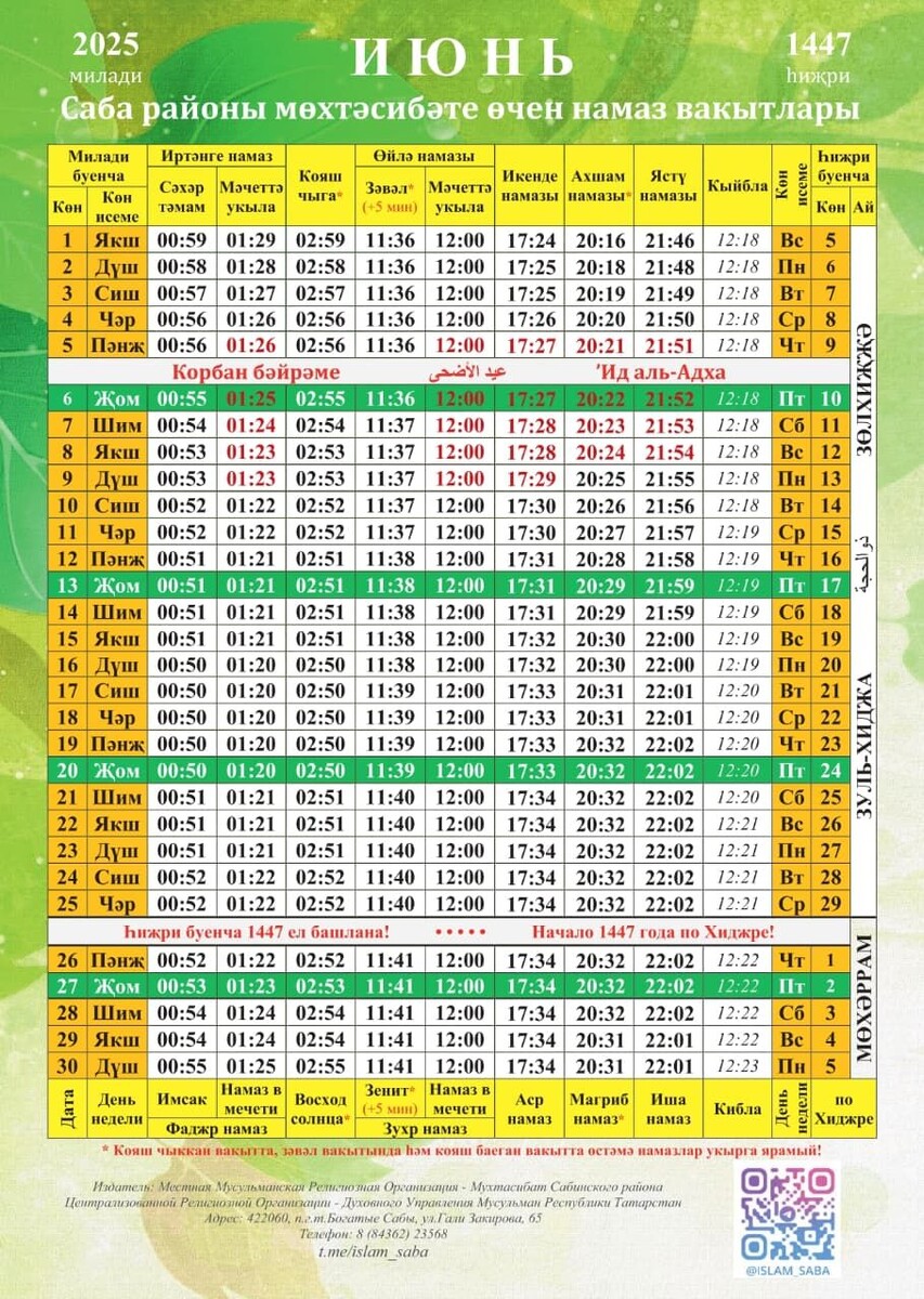🌙Саба районы мөхтәсибәтенең июнь аена намаз вакытлары