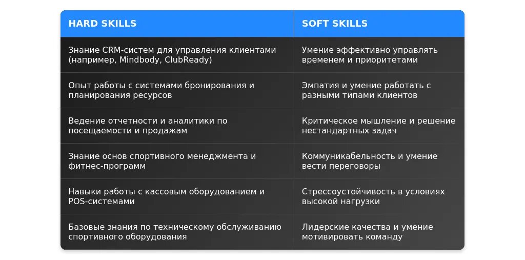 После адаптации: "Управление командой, работа с CRM, организация мероприятий, знание специфики спортивного инвентаря".