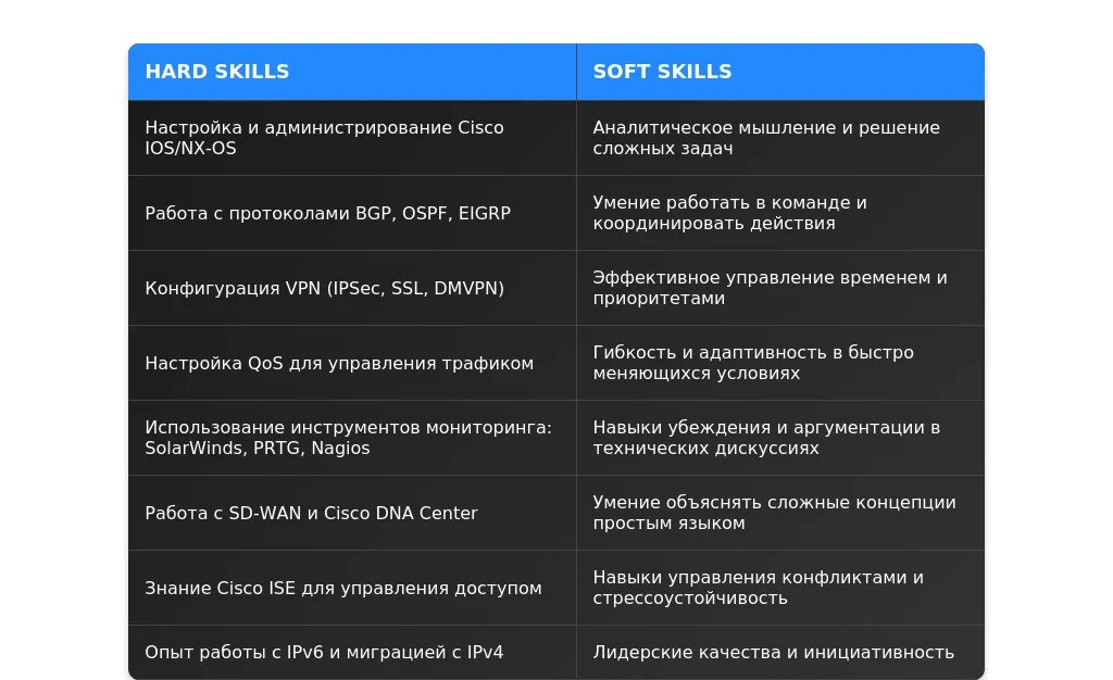 Качества и навыки: аналитическое мышление, знание Cisco IOS, базовые навыки сетевой безопасности, коммуникабельность.
