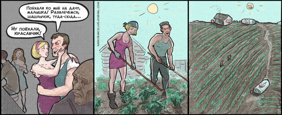 Лето продолжается и идеи для летних подборок комиксов у меня пока что тоже все еще не закончились. Например, в этот раз я решил собрать для вас десяток забавных зарисовок про дачу - чем не летняя тема? В общем, сегодня вас ждут сюжеты про садовые работы, комаров, урожай, дачную моду и многое другое. Надеюсь, что вам понравится! Новосибирская художница Анастасия Икусова является автором серии комиксов с необычным названием АПАТЯПАТЯ! Выпуски данного проекта представляют из себя колоритные и очень смешные зарисовки преимущественно на жизненные темы. Есть вот, к примеру, выпуск про нюансы дачного отдыха. Питерский художник Павел Назим - автор паблика «Инженерная графика» - рисует комиксы и иллюстрации на разные темы, а недавно у него выходил печатный артбук с лучшими работами под названием «Природоведение». Следующая иллюстрация, кстати, как раз связана с природой. Проект под названием Нечистушки от Олега Дернова и Елены Лихачёвой - это короткие смешные стишки и дополняющие их забавные ил