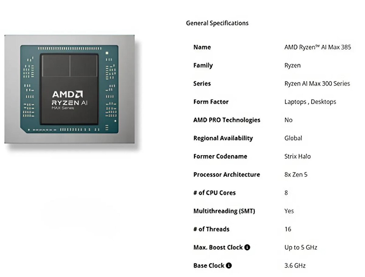 Компания AMD продолжает расширять линейку процессоров Strix Halo на архитектуре Zen 5, представив более бюджетную модель Ryzen AI Max Pro 385. Этот чип ориентирован на пользователей, которым важен баланс между производительностью, поддержкой ИИ-задач и ценой, что делает его альтернативой топовому Ryzen AI Max Pro 395 с 16 ядрами и 32 потоками. Ryzen AI Max Pro 385 оснащён 8 ядрами и 16 потоками с базовой частотой 3.6 ГГц и возможностью разгона до 5.0 ГГц. Несмотря на сокращение количества ядер по сравнению с флагманом, процессор сохраняет ключевые преимущества Zen 5, включая энергоэффективность и высокую скорость обработки данных. Графическая часть представлена интегрированным GPU Radeon 8050S с архитектурой RDNA 3.5, который уступает топовой Radeon 8060S всего на 8 вычислительных блоков, что позволяет ему справляться с играми в разрешении 1080p и базовыми задачами графического дизайна, оставаясь вторым по мощности решением в своём сегменте. Первым устройством, использующим Pro 385, ст