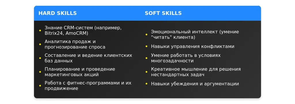 После адаптации: "Навыки работы с CRM-системами (Bitrix24, Salesforce), проведение тренингов для клиентов, увеличение продаж абонементов."