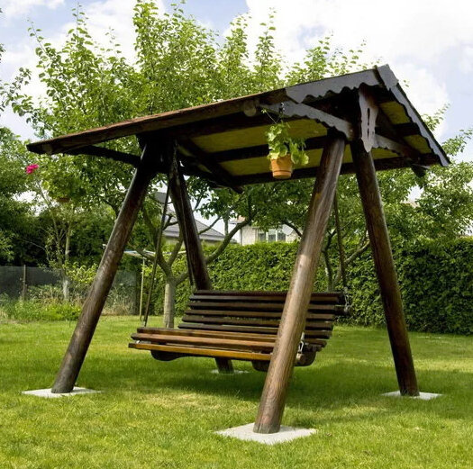 Гамак, кресло-качалка, садовые качели — предметы интерьера, задача которых расслабить тело и успокоить дух. Вся прелесть этих объектов в том, что придаваться релаксации можно на открытом воздухе в любое время суток, под мелодию шелеста листьев и пение птиц. Остановимся подробнее на таком устройстве, как садовые качели. В идеале, если пространство Вашего участка позволяет, они должны быть двуместными (как минимум). Да и в целом, под качели нужен участок, который позволял бы маятной части беспрепятственно проделывать свой действующий радиус. Ещё больше основных тонкостей при построении качелей мы осветили ниже. Важными моментами в конструкции качелей является фундамент, устойчивые опорные части и сбалансированное положение сидячего места. Во-первых, опорные части необходимо залить цементом, чтобы во время эксплуатации они не раскачались и не утратили свою надёжность. Основную площадку специалисты рекомендуют уплотнить: засыпать гравием или выложить плитку/камень. В противном случае, со в