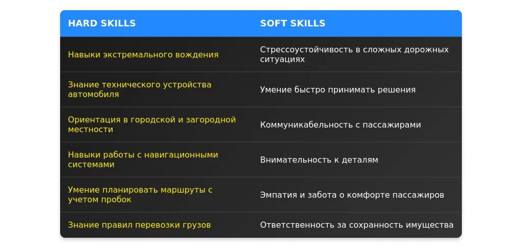 - Уникальные навыки, такие как обучение новых водителей.