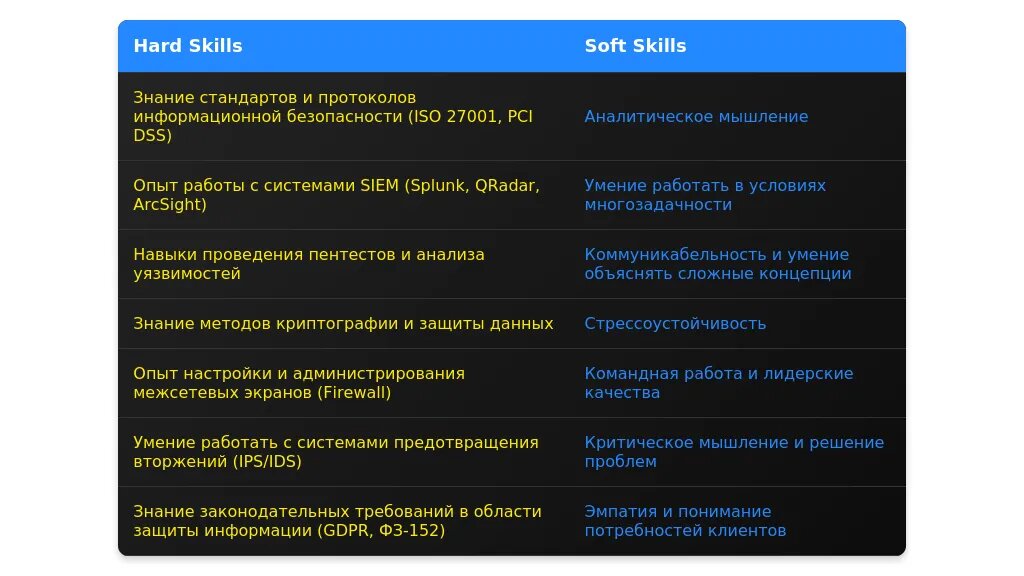 После: "Знание криптографии, опыт работы с системами SIEM и DLP, сертификат CISSP."