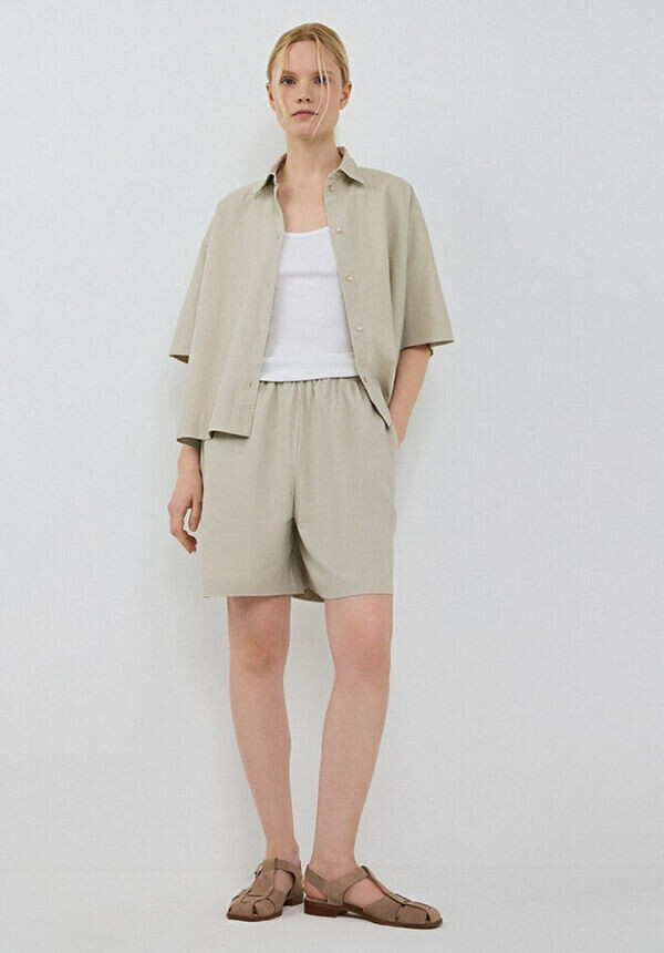 Простые, но очень стильные — эти светло-бежевые шорты от O’STIN идеально подойдут для тех, кто ценит комфорт и лаконичность. Свободный крой, средняя длина и мягкая ткань с льняной текстурой создают расслабленное летнее настроение. Эластичный пояс добавляет удобства, а нейтральный оттенок легко комбинируется с базовыми вещами.