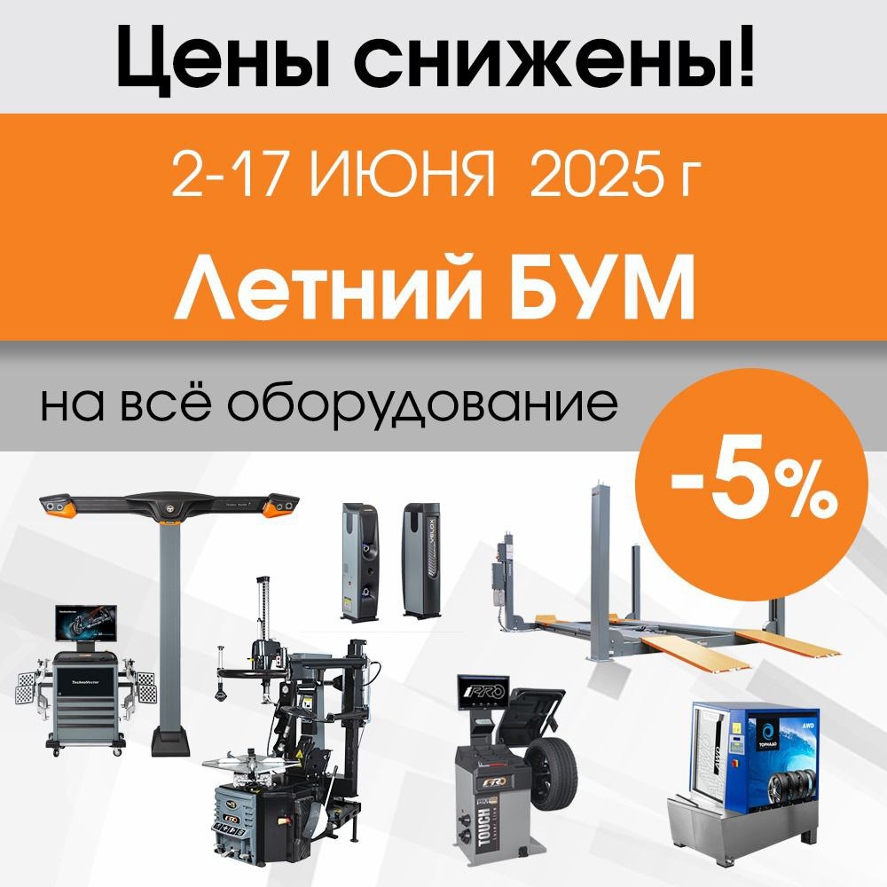 2-17 июня 2025 компания Технокар проводит акцию "Летний БУМ"🌞 В период акции на всё оборудование, представленное на сайте компании, действует СКИДКА 5%. Скидка распространяется на: ▪️стенды сход-развала ТехноВектор ▪️подъемники ТехноВектор ▪️шиномонтажные и балансировочные станки iPRO ▪️мойки колес Торнадо. ☝️Скидка действует только при 💯% оплате заказа до 17.06.2025 включительно. Подробности акции: https://www.technovector.ru/news/skidki-5-na-produktsiyu-kompanii-technocar Актуальные цены на сайте: https://www.technovector.ru/catalog/