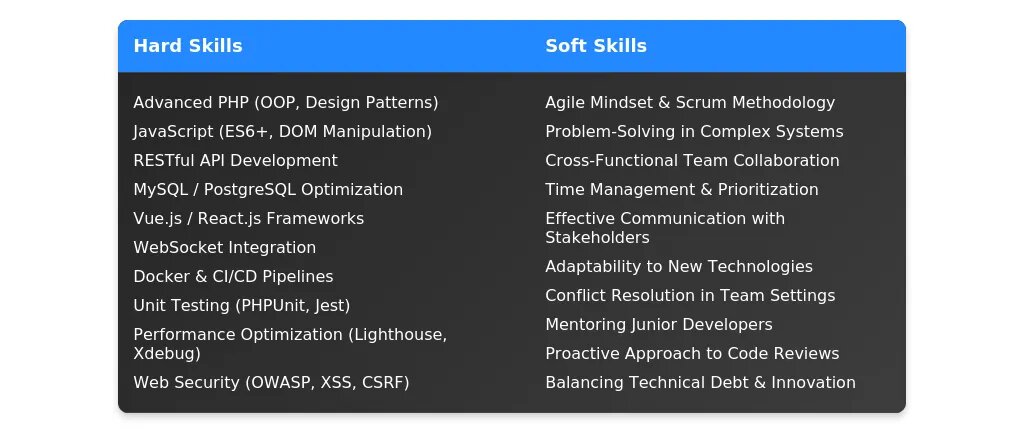 Перегруппируйте навыки так, чтобы они соответствовали требованиям вакансии. Выделите ключевые компетенции, такие как знание PHP, JavaScript, фреймворков и инструментов, упомянутых в вакансии.