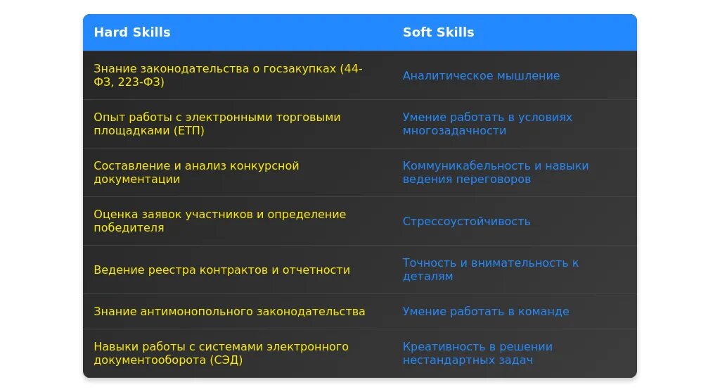 Пример 2: "Знание законодательства в сфере госзакупок". Обязательное требование – знание 44-ФЗ и 223-ФЗ, желательное – опыт участия в судебных разбирательствах по спорным закупкам.