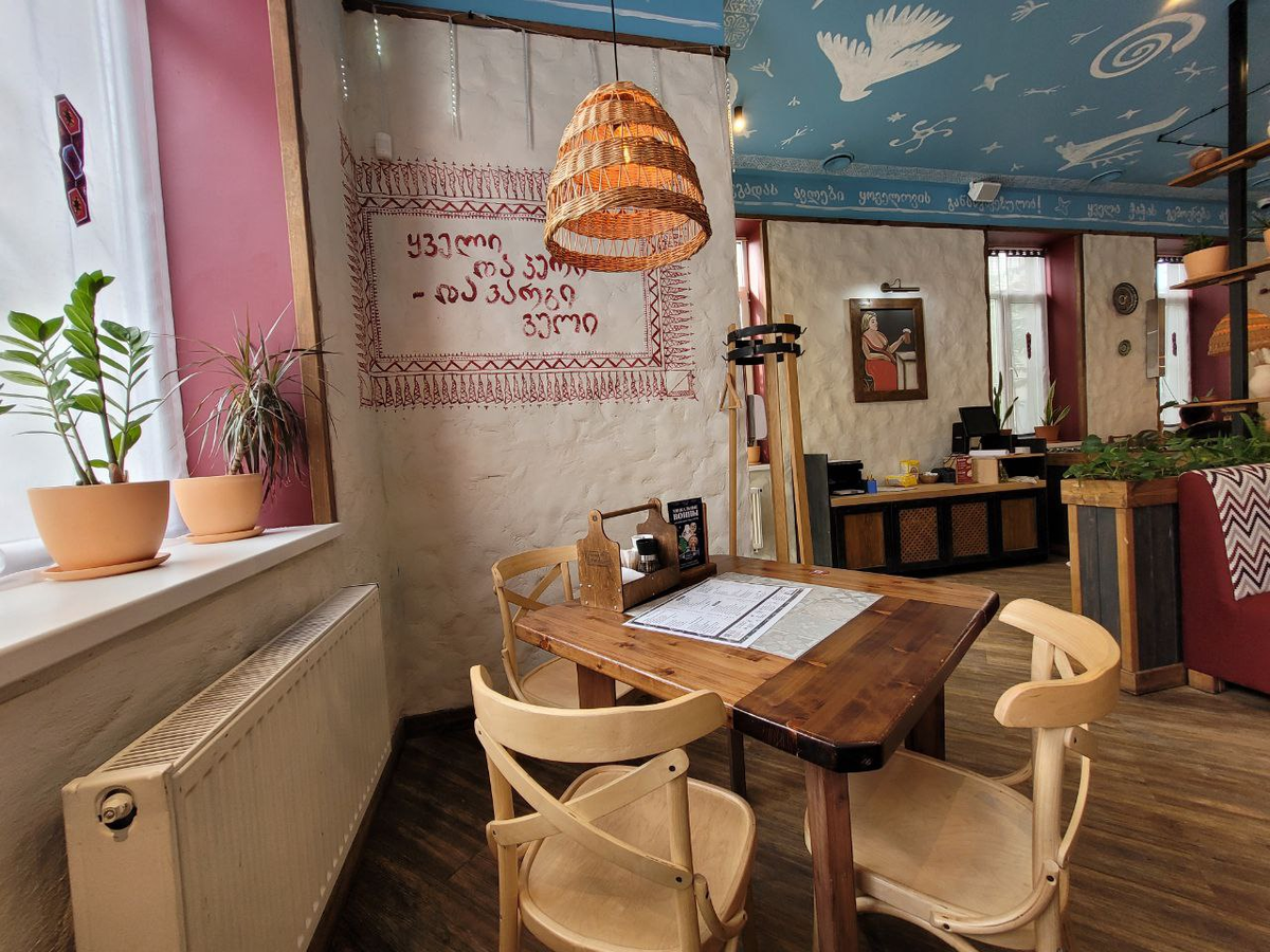 Внутри интерьер с лёгким грузинским флёром. На стене висит забавный счётчик съеденных хинкали, информацию на котором, видимо, вручную обновляют каждый день. Скромные столики со стульями и диванчиками, зелёные растения, пачки муки и картины в тему заведения. Чистая уборная с роликом для одежды, щёткой для обуви и кремом для рук. Я не знаю, как назвать правильно это милое заведение: «рестораном» или «семейным бистро». Но мне было уютно, чего-то чрезмерного я от него не ждала.