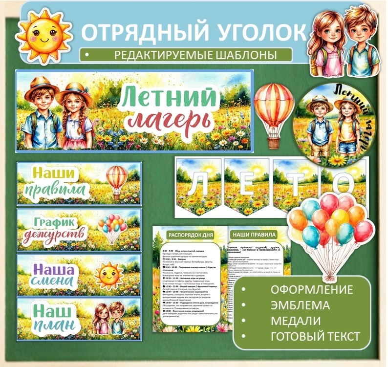 Что нужно, чтобы оформить стенд или отрядный уголок? Цветной принтер и немного времени. Потому что у меня уже сделаны готовые шаблоны для оформления. Останется только распечатать, склеить (если будете делать баннер) и прикрепить на стену или стенд.