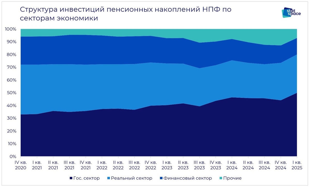 По данным ЦБ, в 1 квартале 2025 года доля инвестиций в госсектор в общей структуре инвестиций негосударственных пенсионных фондов достигла рекордных 50%. В начале 2021 года, для сравнения, на госсектор приходилось только 33% инвестиций НПФ - неслабый такой рост в полтора раза за четыре года!
