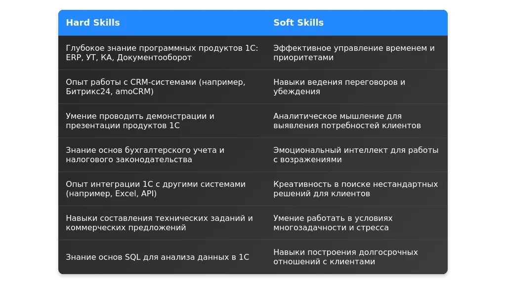 После адаптации: "Навыки продаж программных продуктов 1С, работа с CRM-системами, ведение переговоров с крупными клиентами."