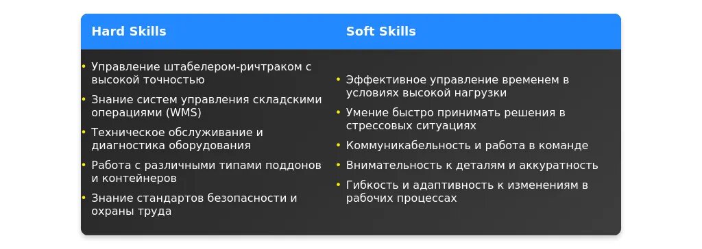 - Технические навыки: Управление ричтраком, работа с системами WMS, знание техники безопасности.